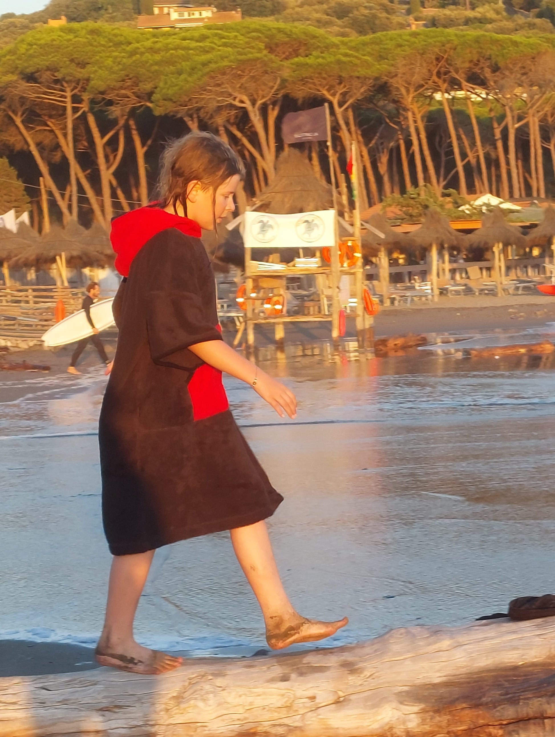 SIMPLY RED vereint Funktionalität, Stil und Komfort – perfekt für alle, die Strand, Surfen, Winterschwimmen und Entspannung nach dem Schwimmen lieben. Hergestellt aus weichem, natürlichem Baumwollfrottee (100 %, 400 g/m²) , absorbiert es Feuchtigkeit schnell und wärmt angenehm. Die leuchtend rote Farbe mit schwarz-weißer Hahnentritt-Paspelierung verleiht jedem Tag am Wasser Charakter und Energie.