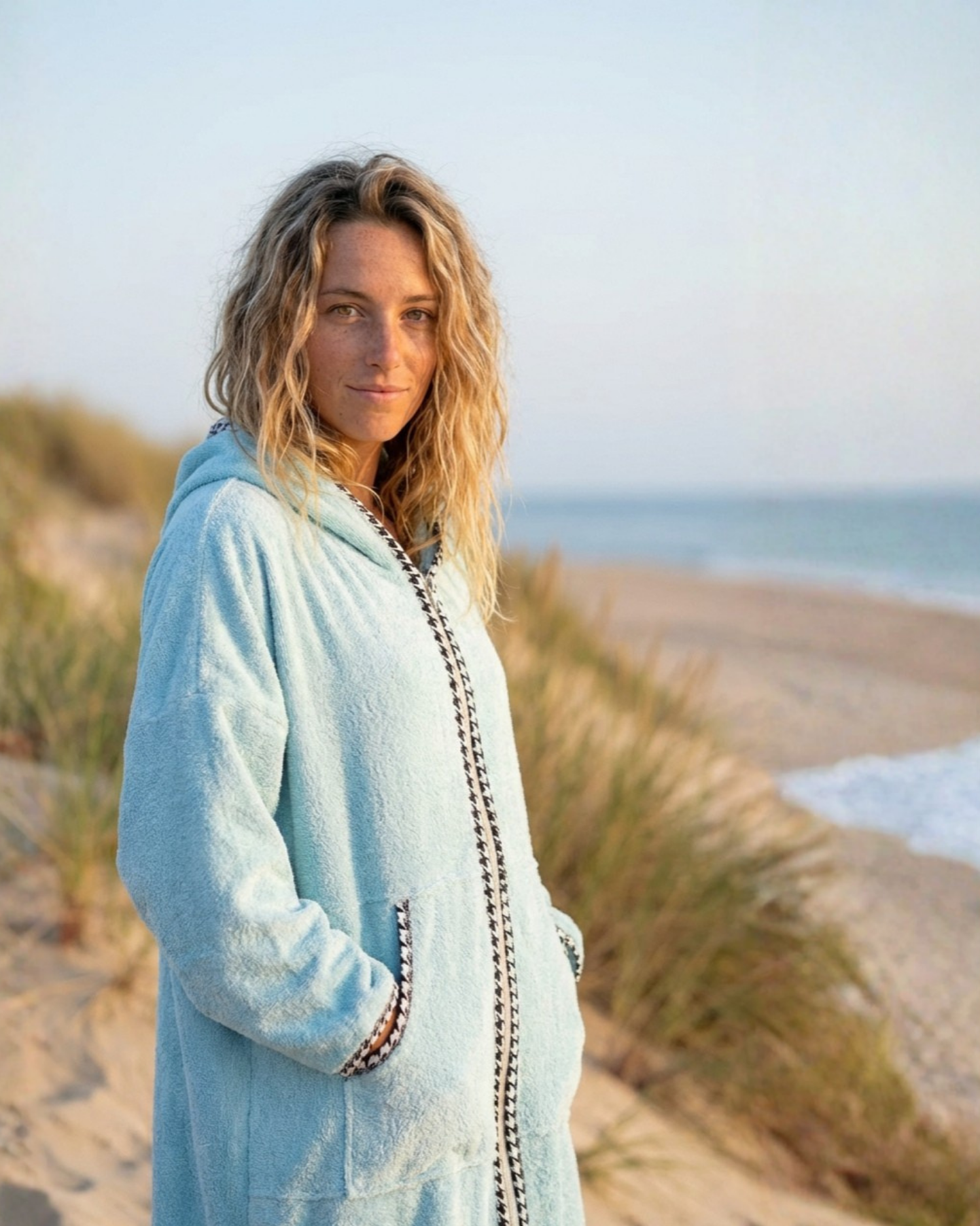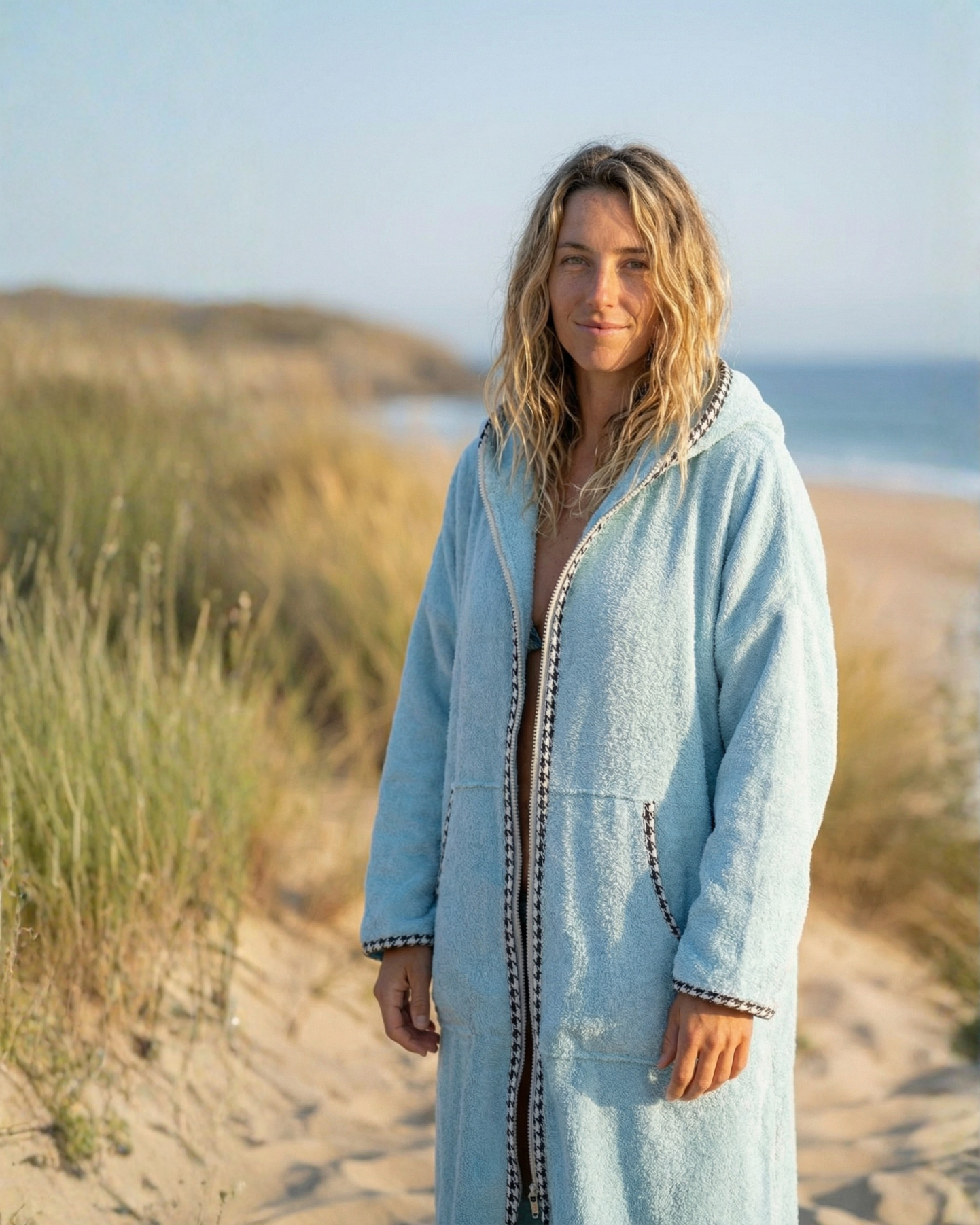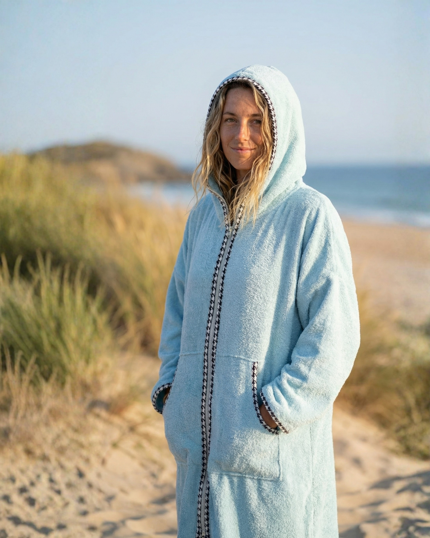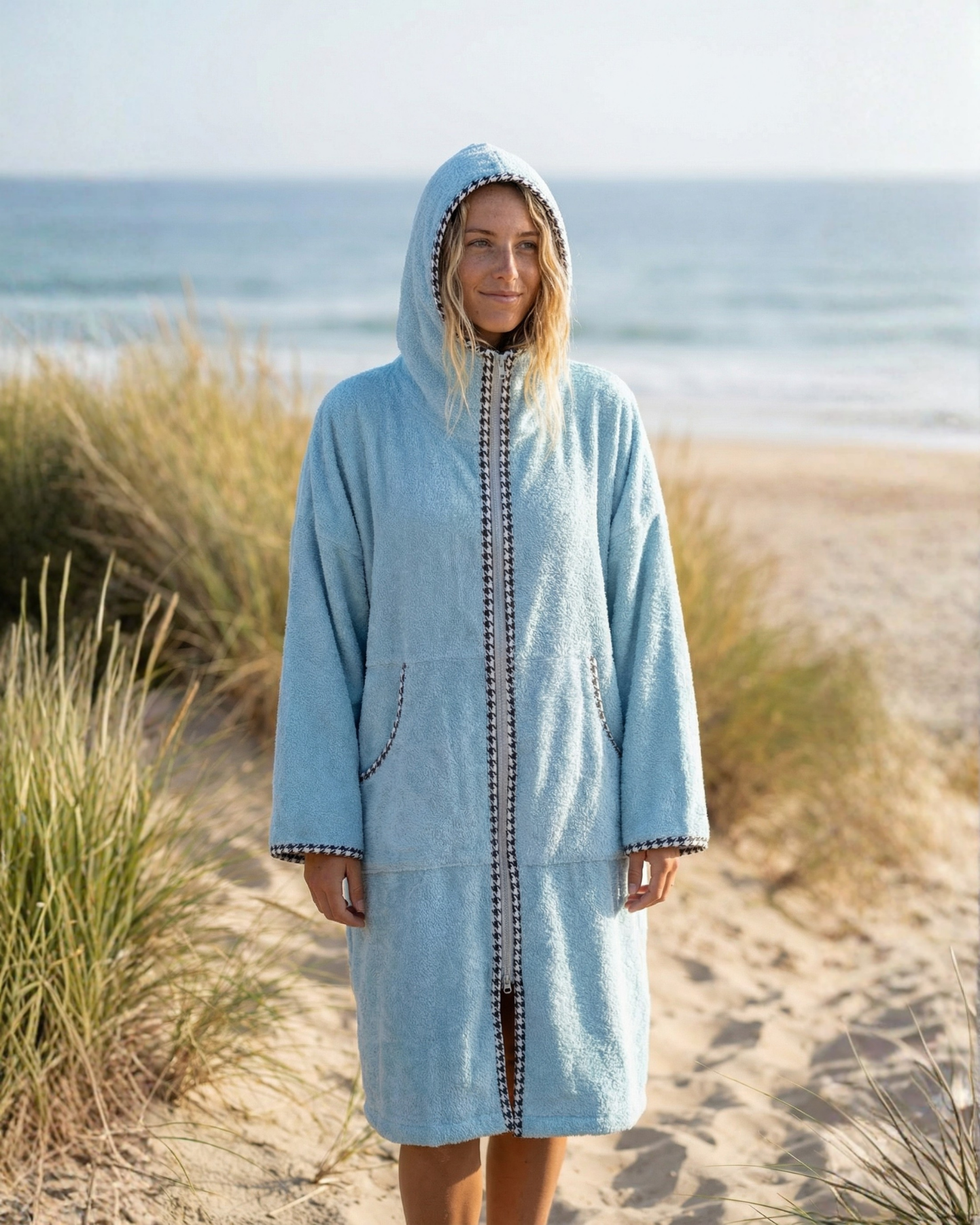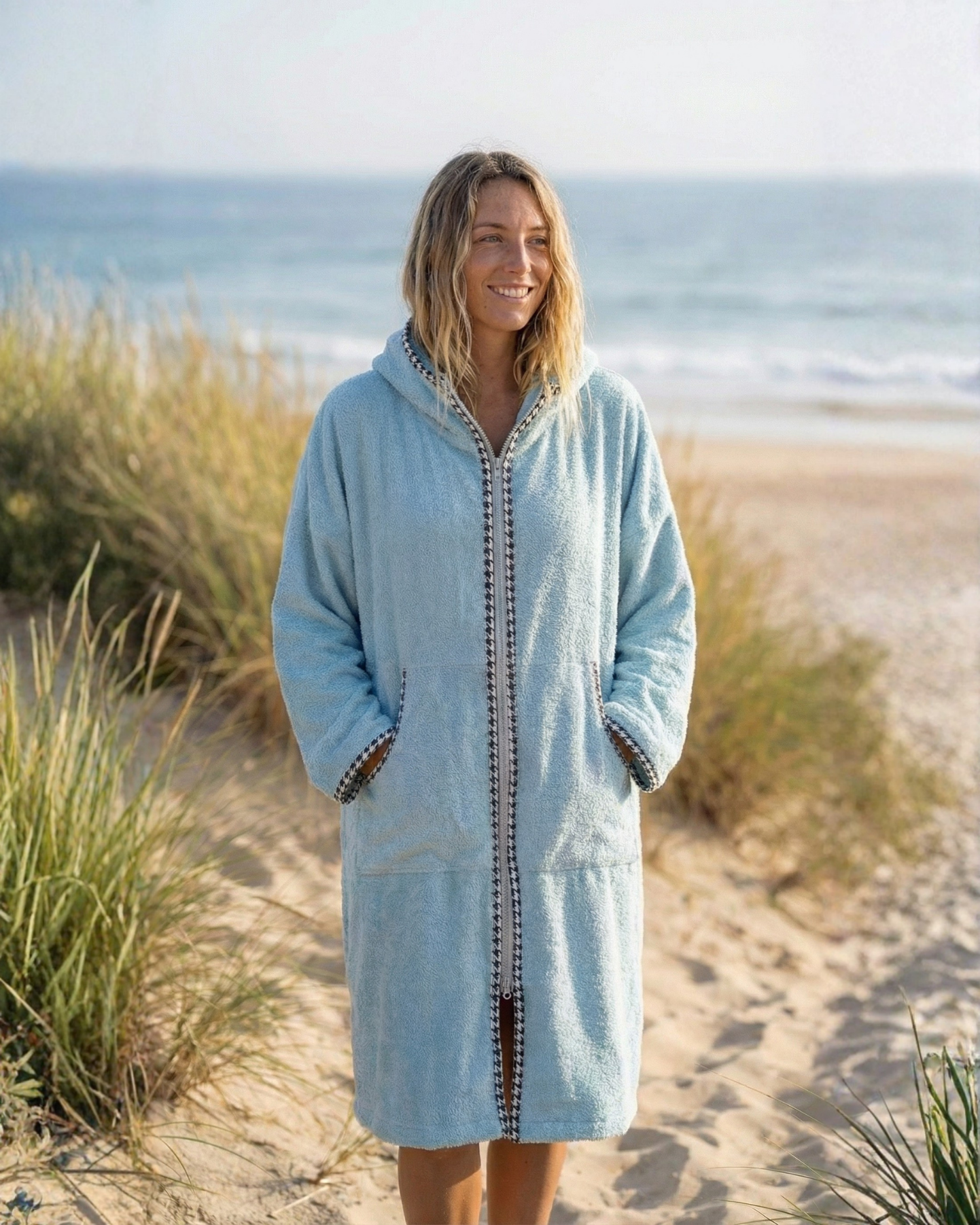 ZIP & STRIP ist ein moderner Strandponcho mit Reißverschluss – ideal für Wassersportler und alle, die aktiv aktiv sind. Hergestellt aus 100 % weichem Baumwollfrottee (400 g/m²) , absorbiert er Feuchtigkeit und wärmt den Körper nach dem Baden schnell wieder auf. Dieses vielseitige Modell vereint die Funktionen von Handtuch, Bademantel und Wickeltasche in einem.