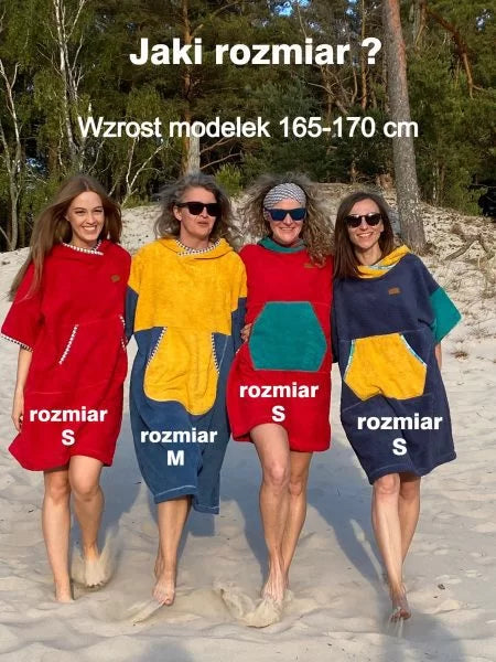 Nasze poncha oprócz zapewnienia ciepła, spełniają także funkcję „przebieralni”. Są na tyle obszerne aby osoba, o standardowej budowie ciała, mogła się w nim swobodnie przebrać. Poncho ma szerokie rękawy umożliwiające przełożenie przez nie rąk do środka. Natomiast jeżeli potrzebujesz poncho, które nie koniecznie będzie służyło Ci za przebieralnie na plaży, a na przykład tylko do przejścia pod prysznic na campingu. Możesz zamówić rozmiar mniejszy.