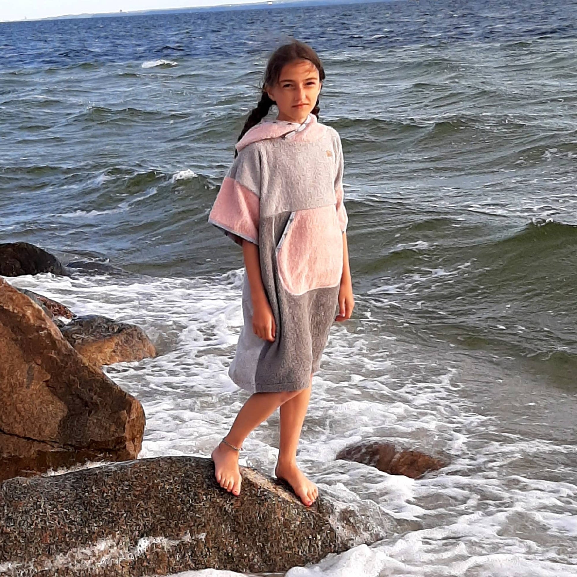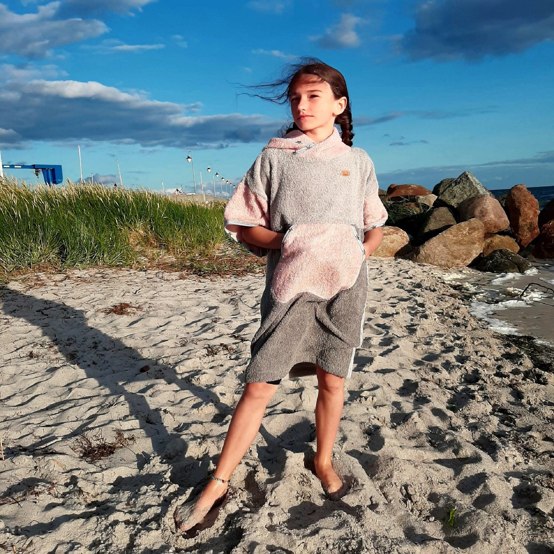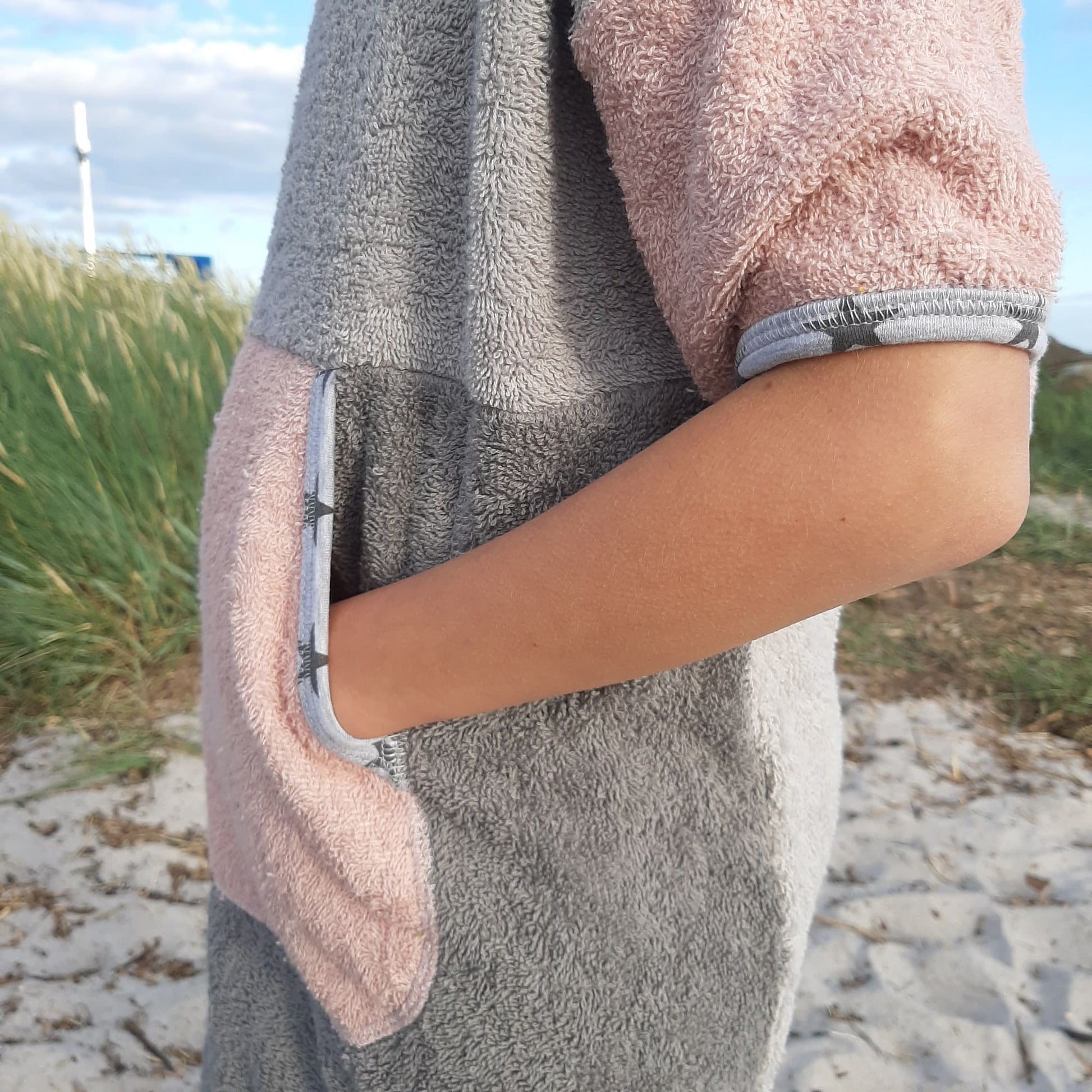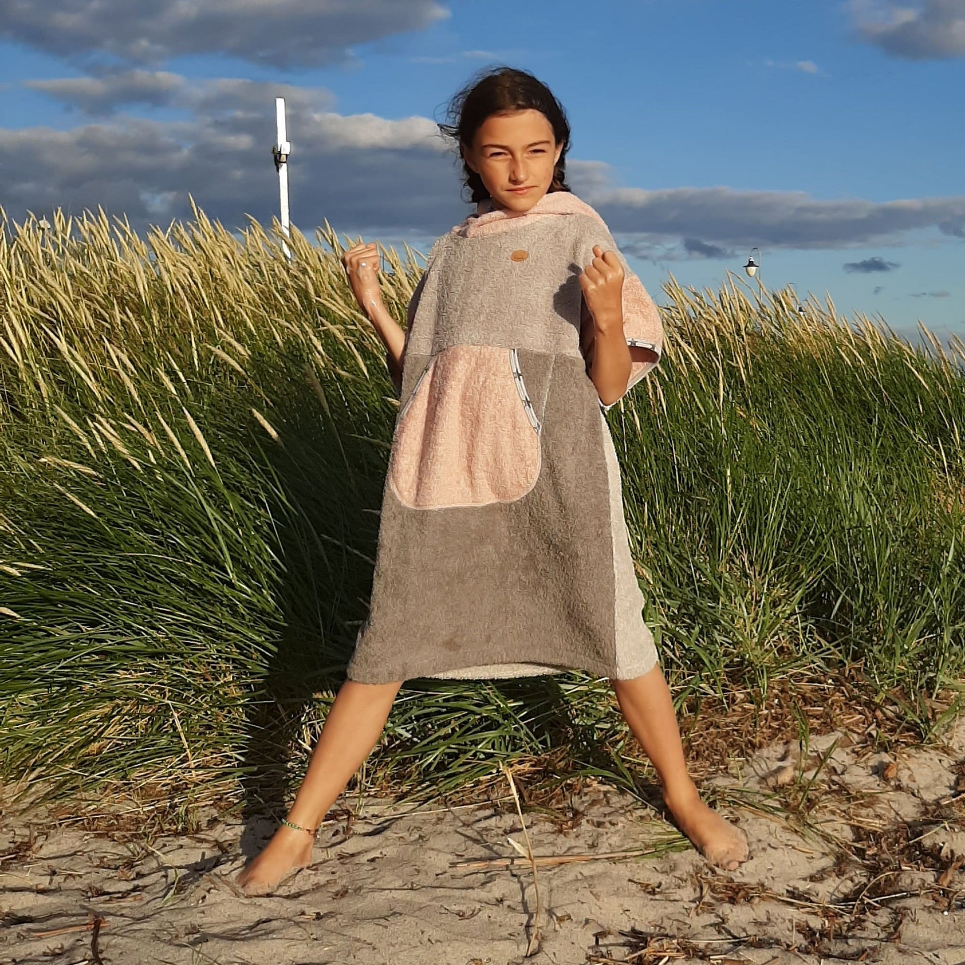 POWDERY STARS łączy miękkość bawełnianej frotte z delikatną paletą szarości i pudrowego różu. To ponczo stworzone dla aktywnych – surferów, morsów i wszystkich, którzy po wodzie chcą szybko się ogrzać i wygodnie przebrać. Działa jak ręcznik, szlafrok i prywatna przebieralnia w jednym – na plaży, basenie, campingu, w kamperze i w domu.