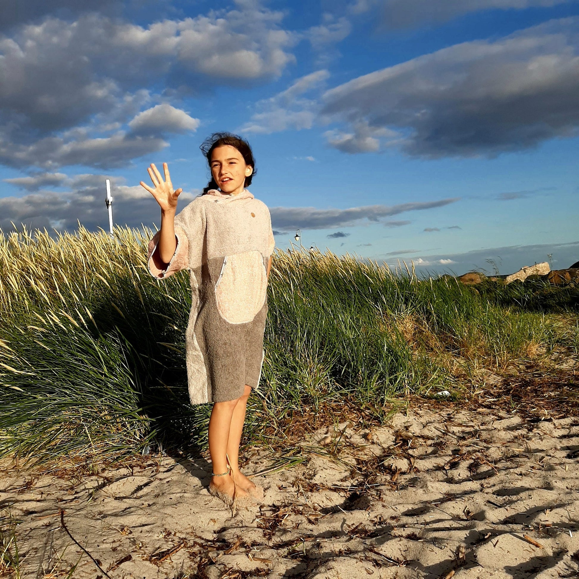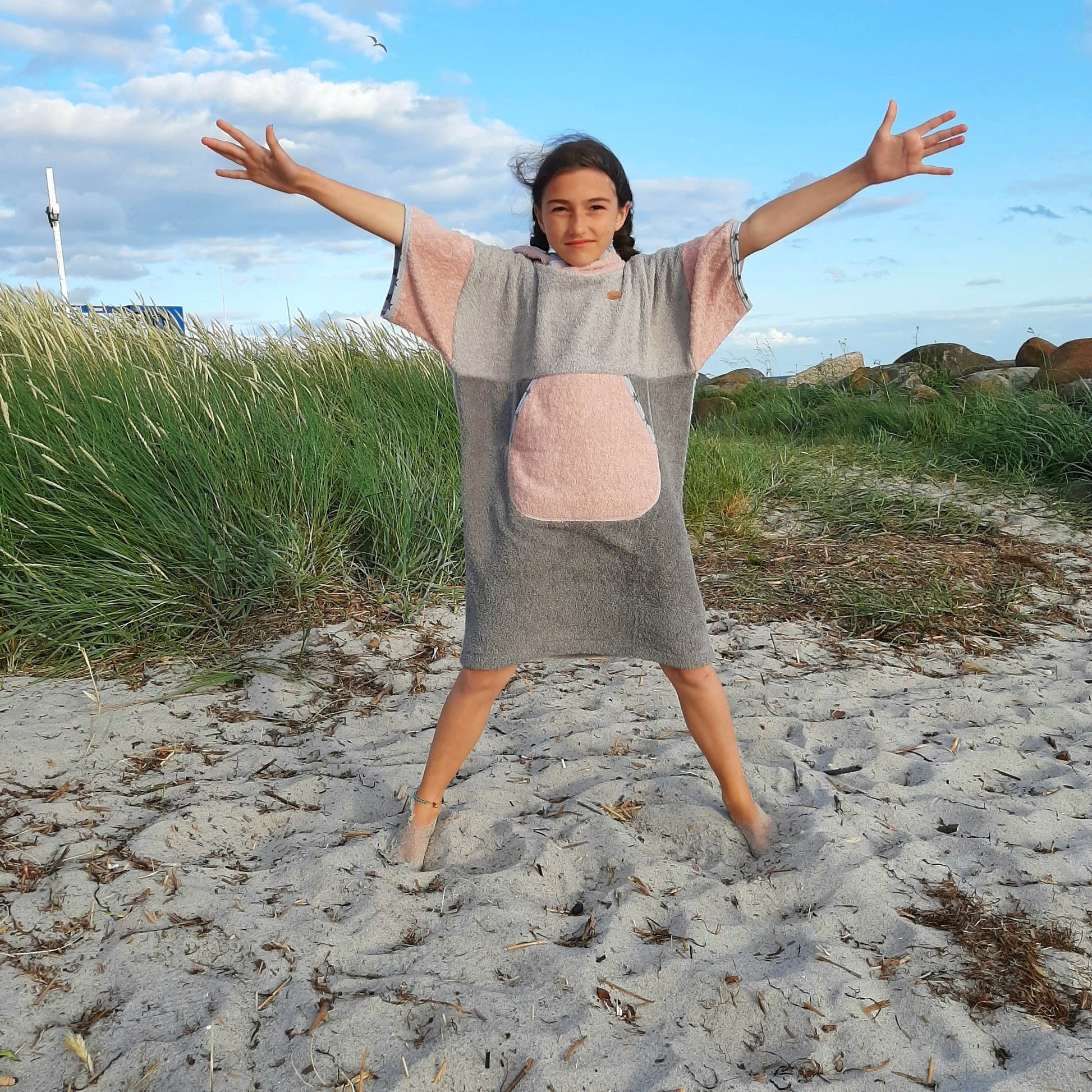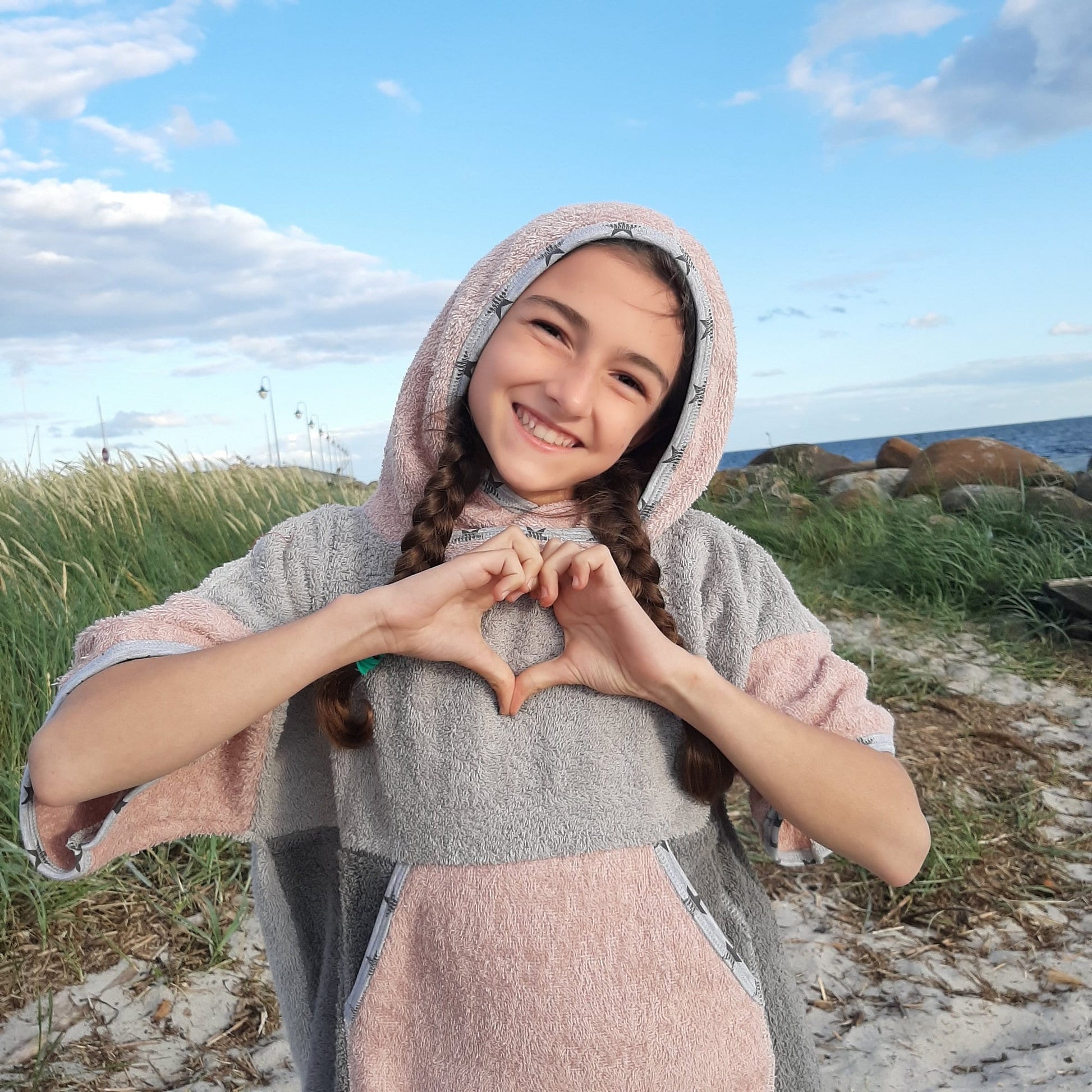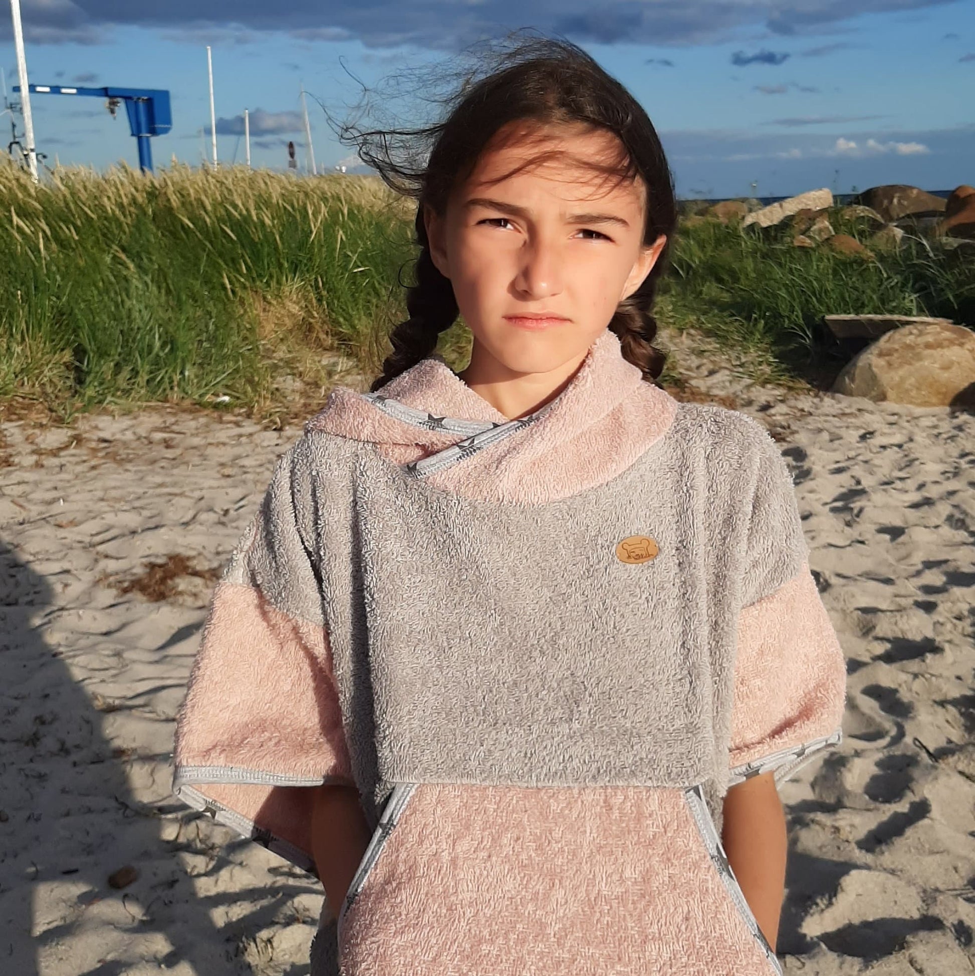POWDERY STARS łączy miękkość bawełnianej frotte z delikatną paletą szarości i pudrowego różu. To ponczo stworzone dla aktywnych – surferów, morsów i wszystkich, którzy po wodzie chcą szybko się ogrzać i wygodnie przebrać. Działa jak ręcznik, szlafrok i prywatna przebieralnia w jednym – na plaży, basenie, campingu, w kamperze i w domu.
