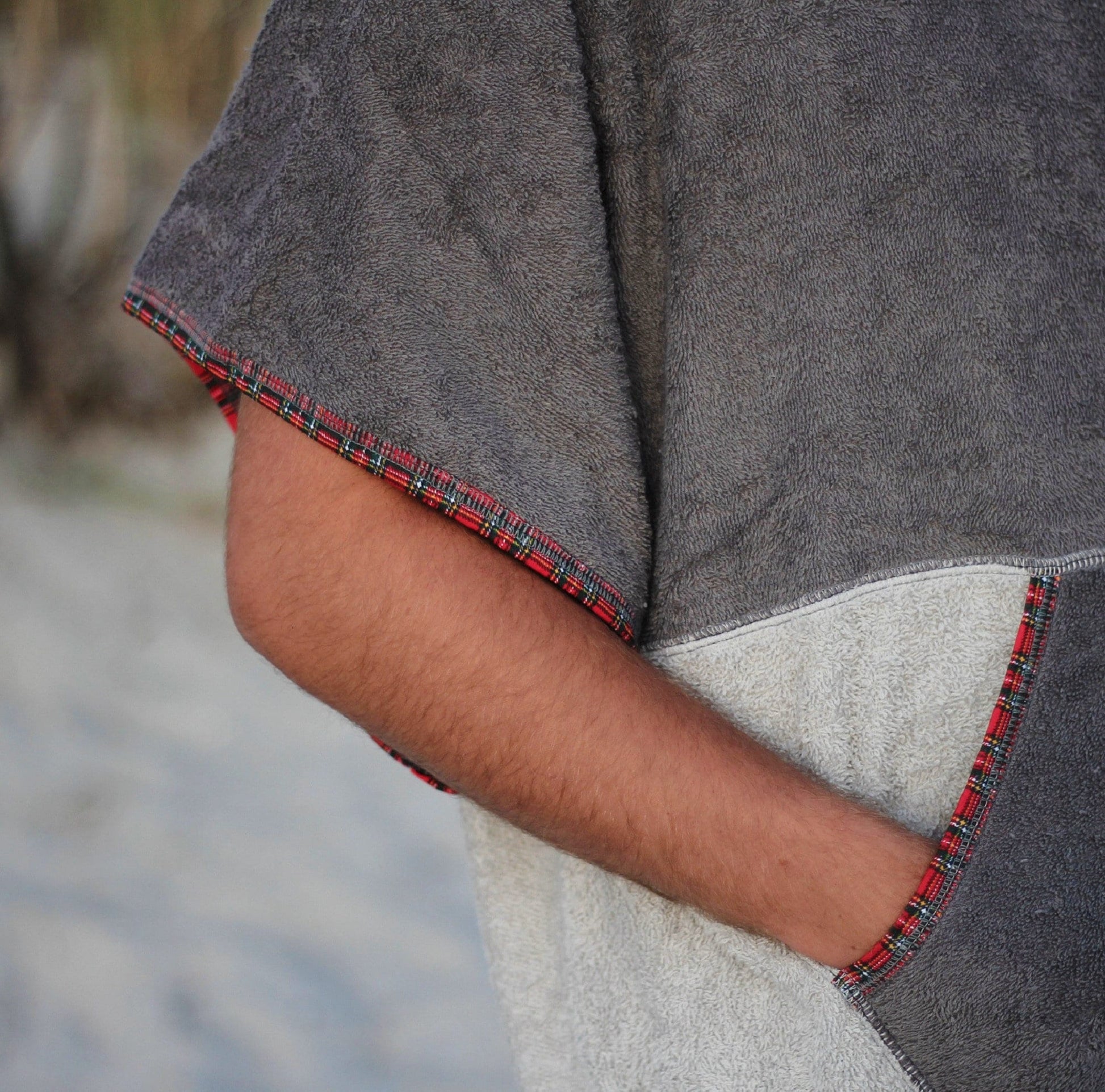 RED SCOTCH to solidne ponczo z naturalnej bawełnianej frotte (100%, 400 g/m²), stworzone z myślą o praktycznym cieple i szybkim przebieraniu po wodzie. Sprawdzi się na plaży, basenie, campingu i w kamperze, a w domu zastąpi szlafrok. Grafit, musztardowy żółty i brązowo-beżowe lamówki nadają mu surowy, „outdoorowy” charakter.