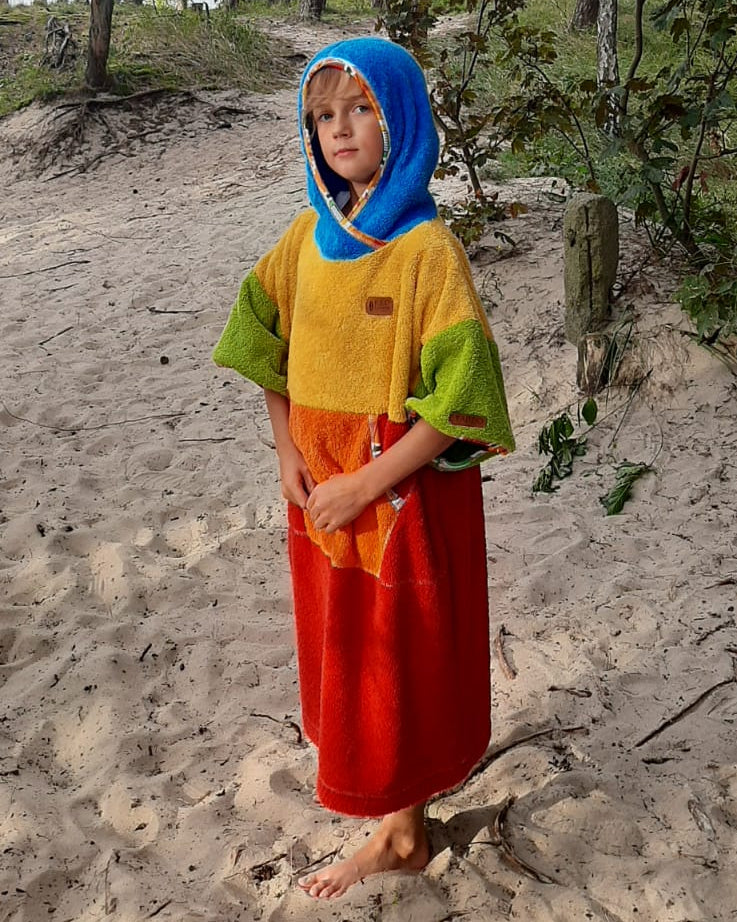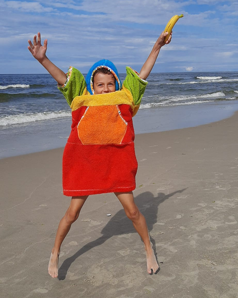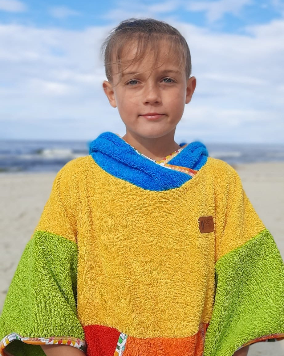 RAINBOW to kolorowe, wielofunkcyjne ponczo z miękkiej 100% bawełnianej frotte (400 g/m²). Świetnie wchłania wodę, szybko ogrzewa i zapewnia wygodne przebranie się w każdym miejscu. Sprawdzi się jako ponczo plażowe, praktyczny szlafrok plażowy po kąpieli lub idealne okrycie po morsowaniu.