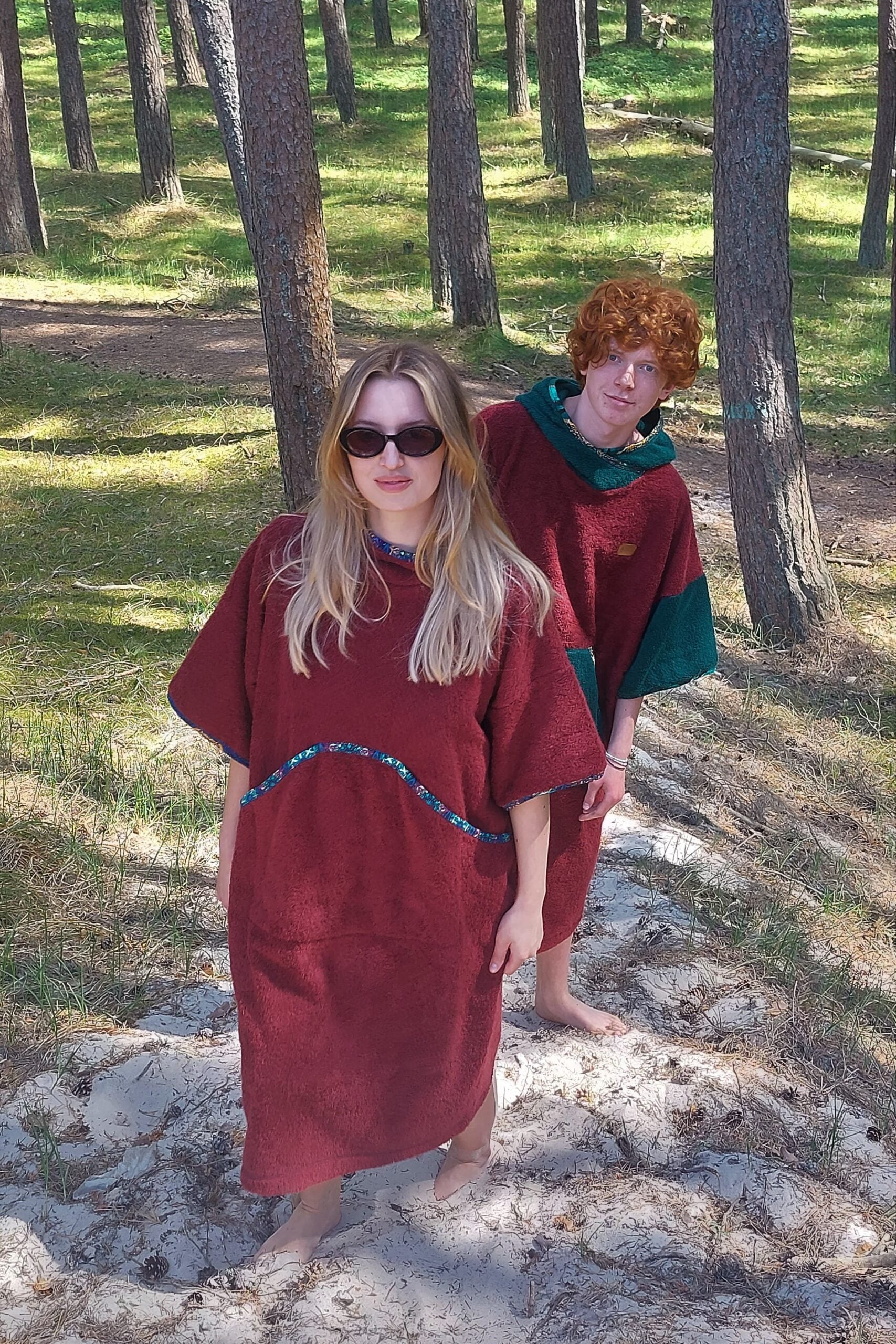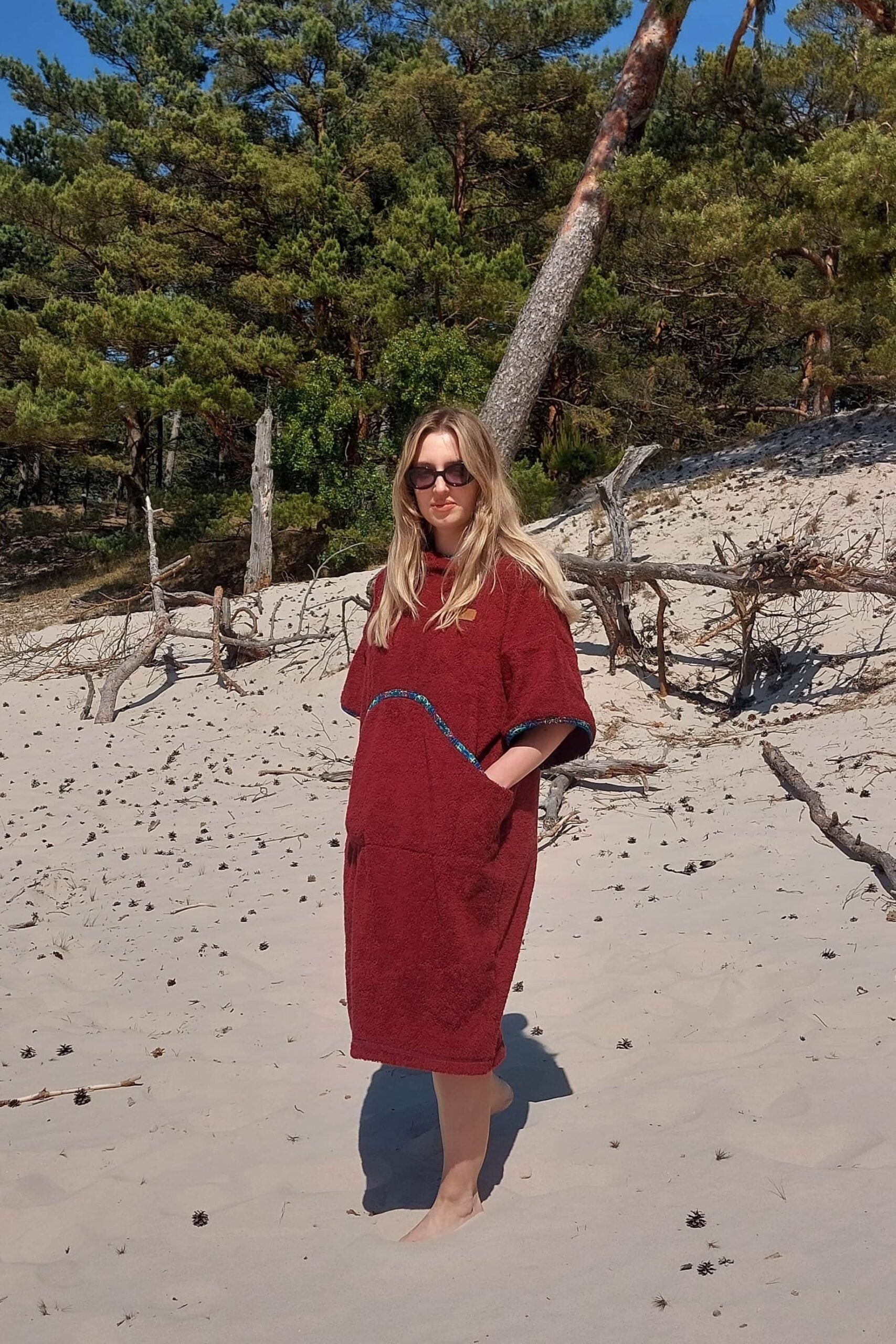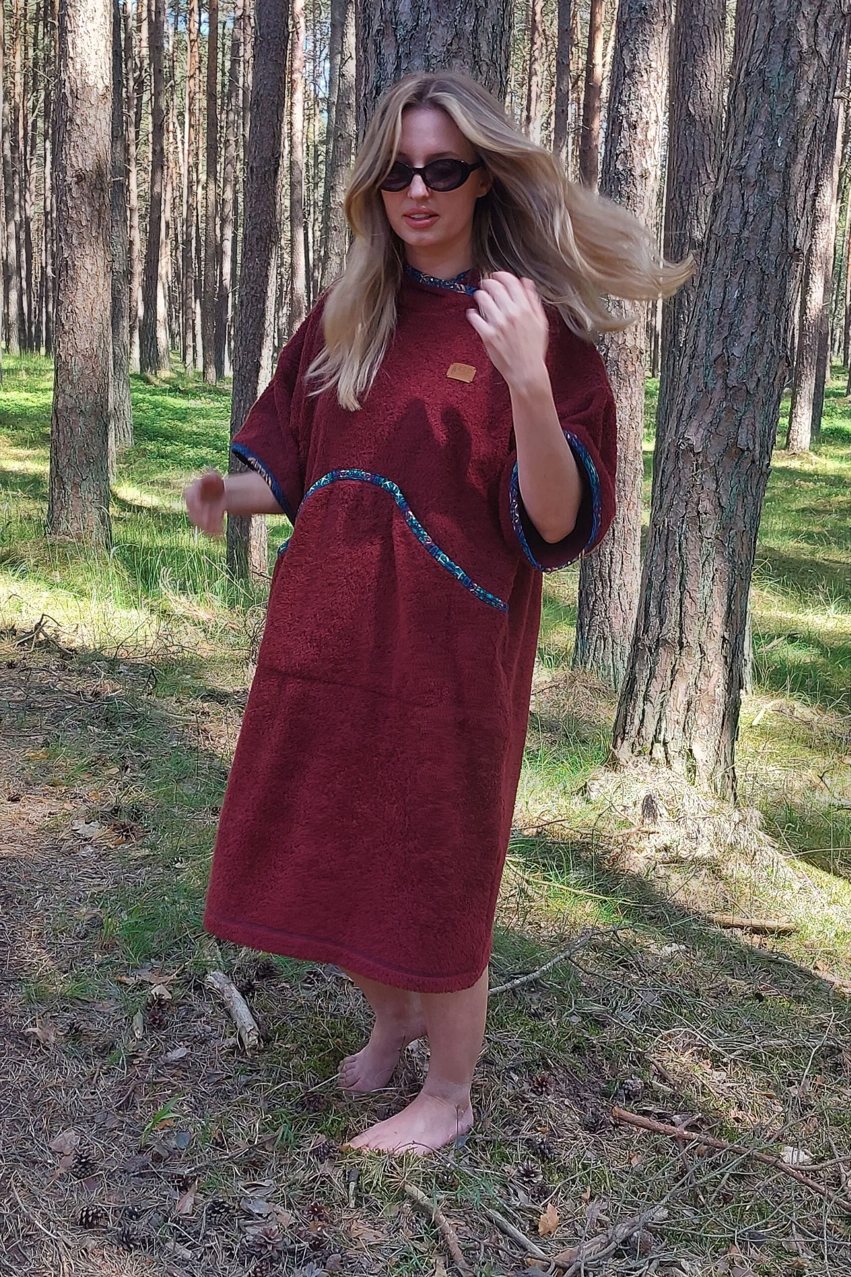 SCARLETT to miękkie, ciepłe ponczo z naturalnej bawełnianej frotte (100%, 400 g/m²), zaprojektowane dla osób kochających wodę i codzienny komfort. Głęboki bordowo-kasztanowy odcień i lamówki z subtelnym wzorem rozet tworzą elegancki, ponadczasowy charakter. Luźny krój otula po kąpieli, pozwala swobodnie się przebrać na plaży czy basenie i dyskretnie podkreśla sylwetkę bez ograniczania ruchów.