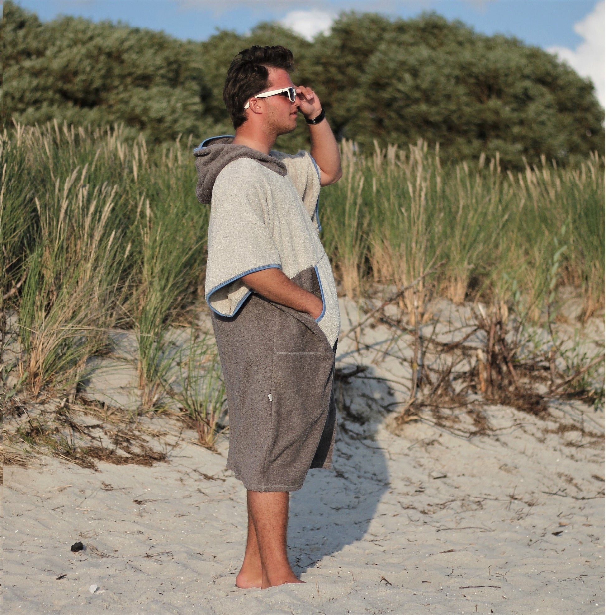 BLUE SAILOR to ukłon w stronę morskiego klimatu – stonowane barwy, solidna bawełniana frotte (100%, 400 g/m²) i krój, który działa jak ręcznik, szlafrok i mobilna przebieralnia w jednym. Po kąpieli szybko wysycha i przyjemnie ogrzewa, a kaptur i obszerna forma gwarantują dyskretne przebranie na plaży, basenie, campingu czy w kamperze. W domu bezproblemowo zastąpi ciepły szlafrok.