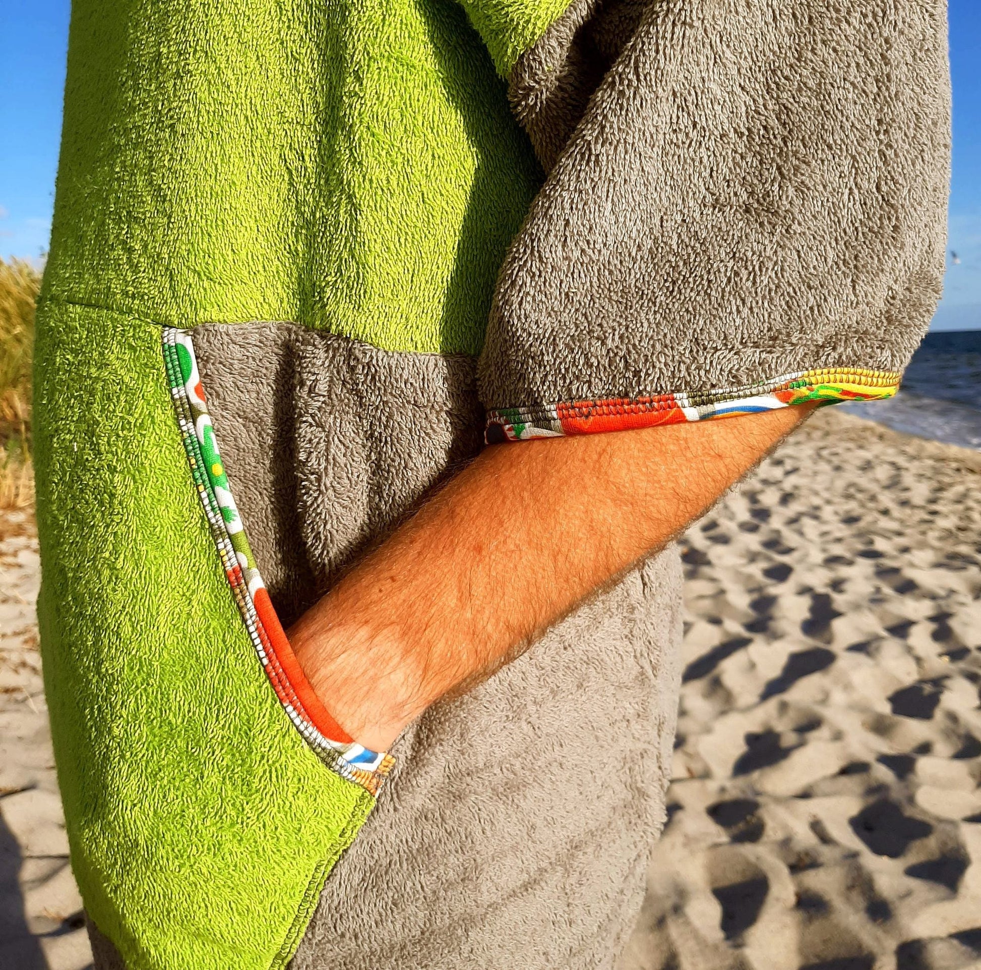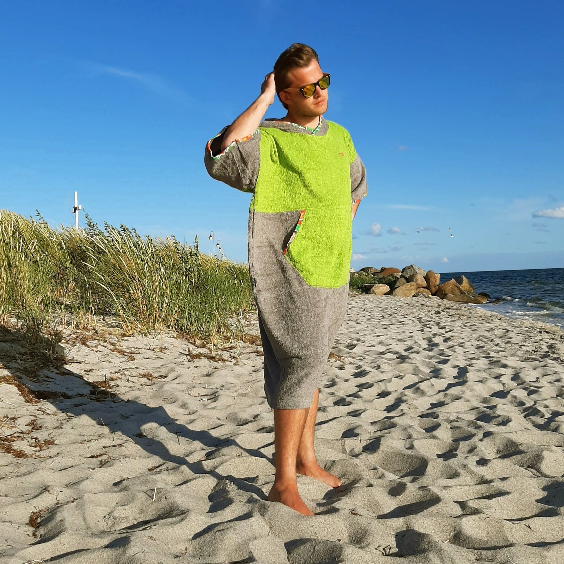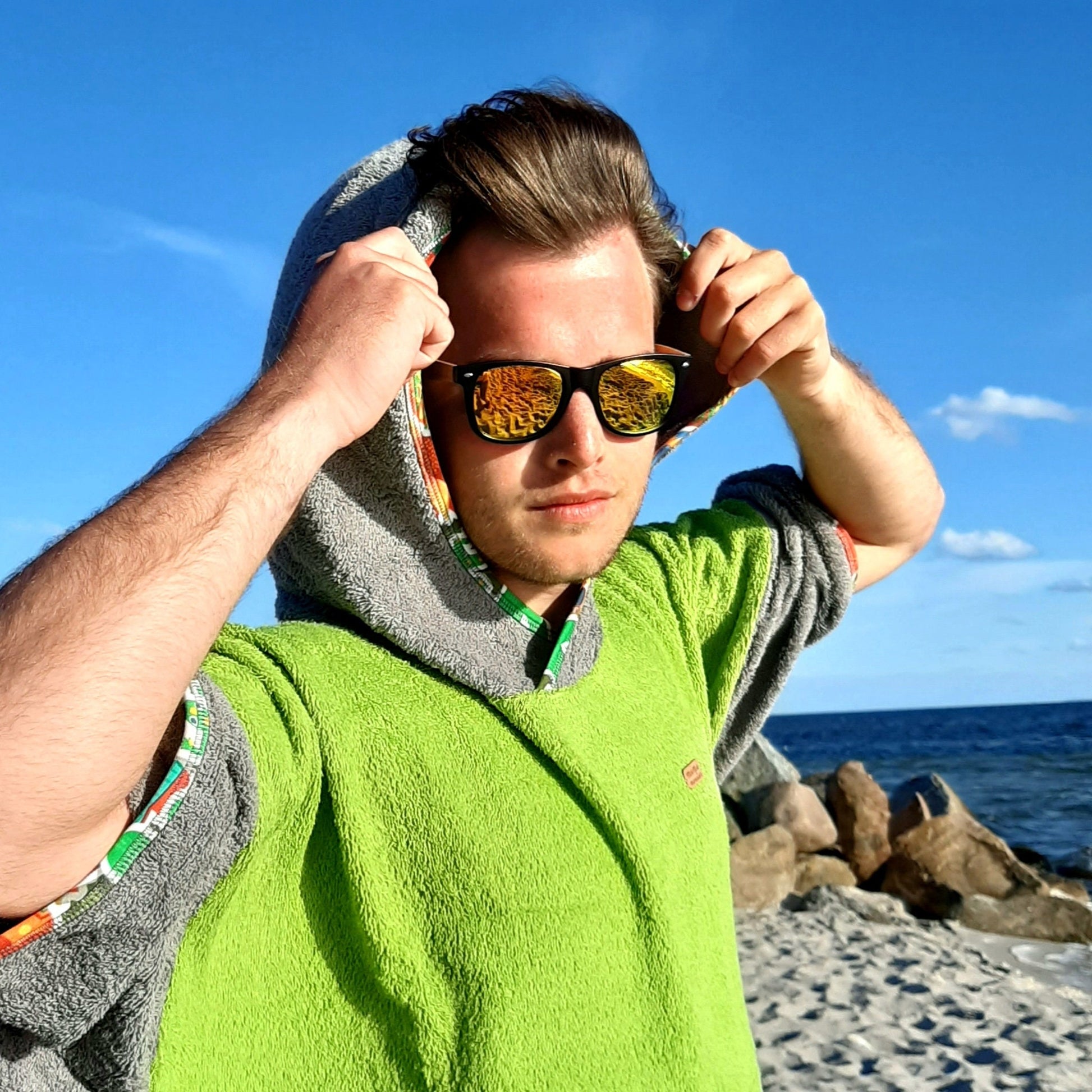 Green Mexico to energetyczne połączenie grafitu i limonki z multikolorowymi lamówkami – widoczne z daleka, praktyczne z bliska. Miękka bawełna frotte 100% (400 g/m²) szybko chłonie wodę i przyjemnie ogrzewa po morzu, jeziorze czy basenie. Luźny krój, duży kaptur i wygodna forma sprawiają, że ponczo działa jak mobilna przebieralnia i lekkie okrycie na plażę, kemping lub do kampera.