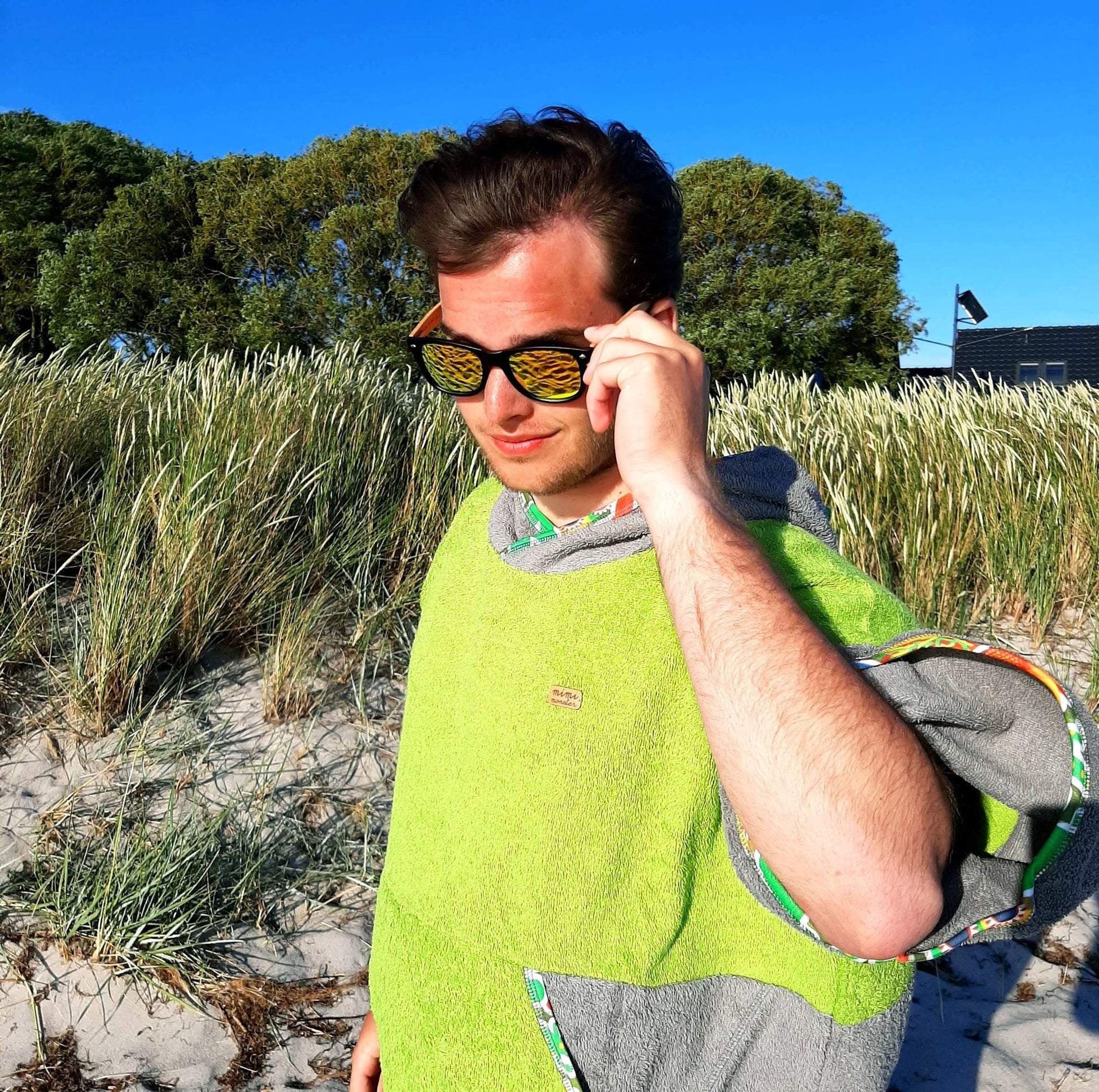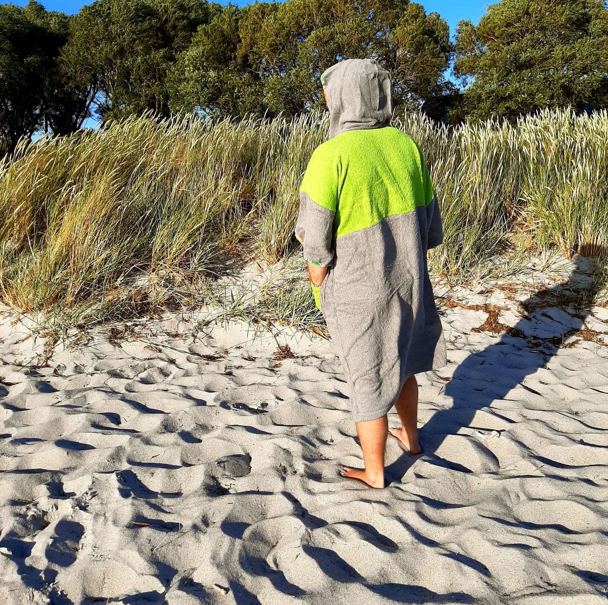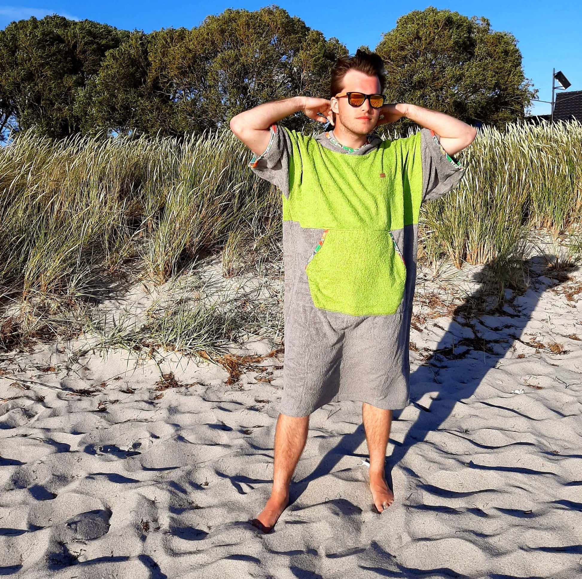 Green Mexico to energetyczne połączenie grafitu i limonki z multikolorowymi lamówkami – widoczne z daleka, praktyczne z bliska. Miękka bawełna frotte 100% (400 g/m²) szybko chłonie wodę i przyjemnie ogrzewa po morzu, jeziorze czy basenie. Luźny krój, duży kaptur i wygodna forma sprawiają, że ponczo działa jak mobilna przebieralnia i lekkie okrycie na plażę, kemping lub do kampera.
