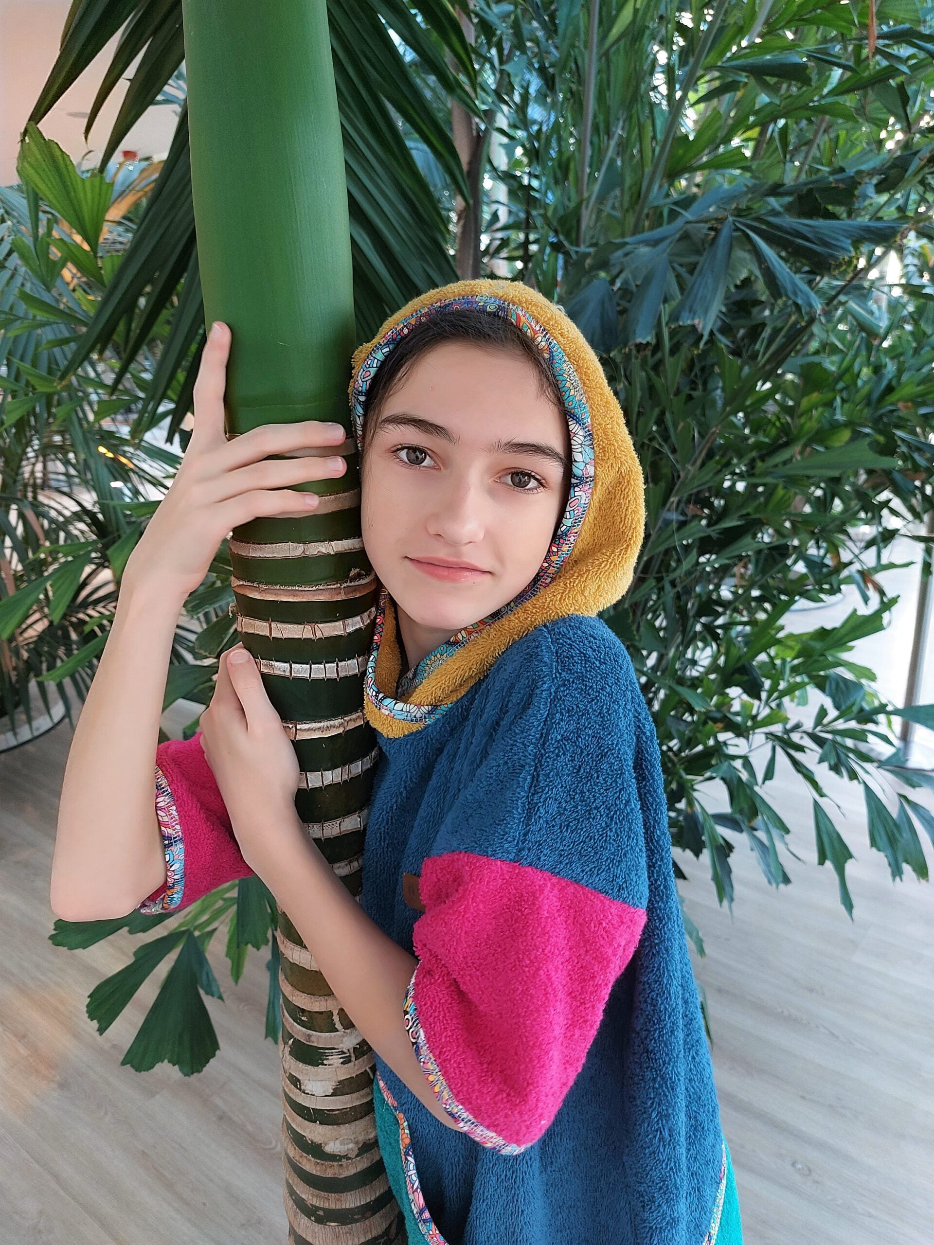 - Trzy kieszenie = maksimum wygody: duża kieszeń typu „kangurka” + dwie boczne magiczne kieszonki bez dna – dzięki nim możesz swobodnie przebrać strój kąpielowy.