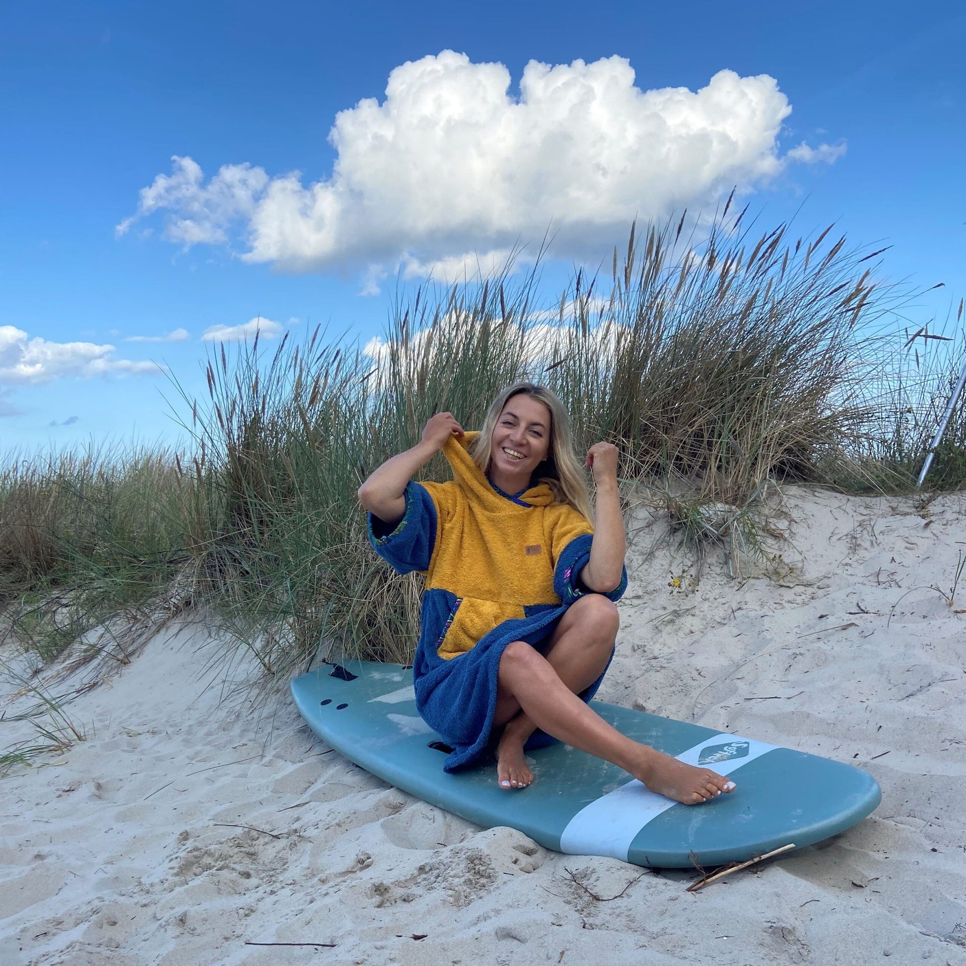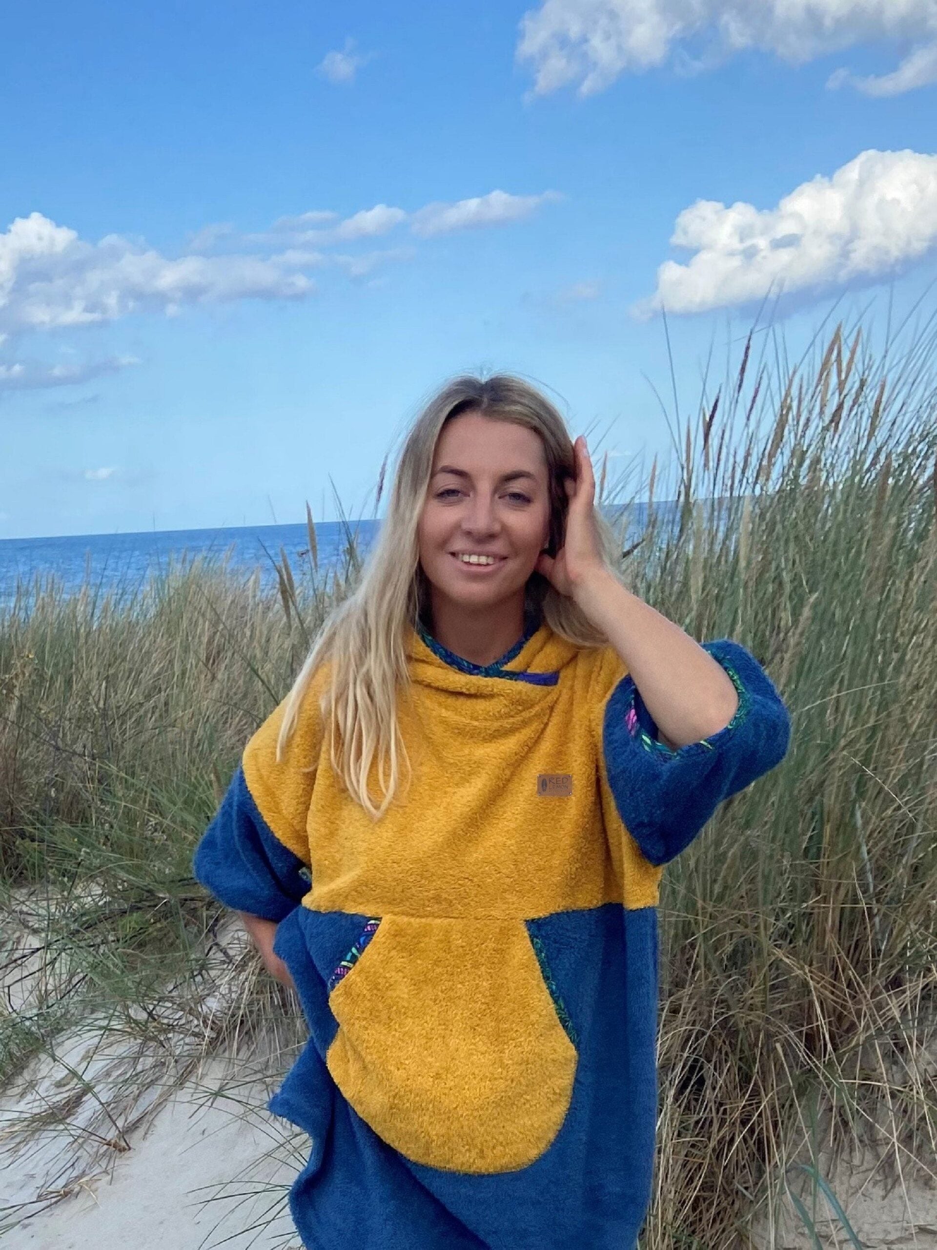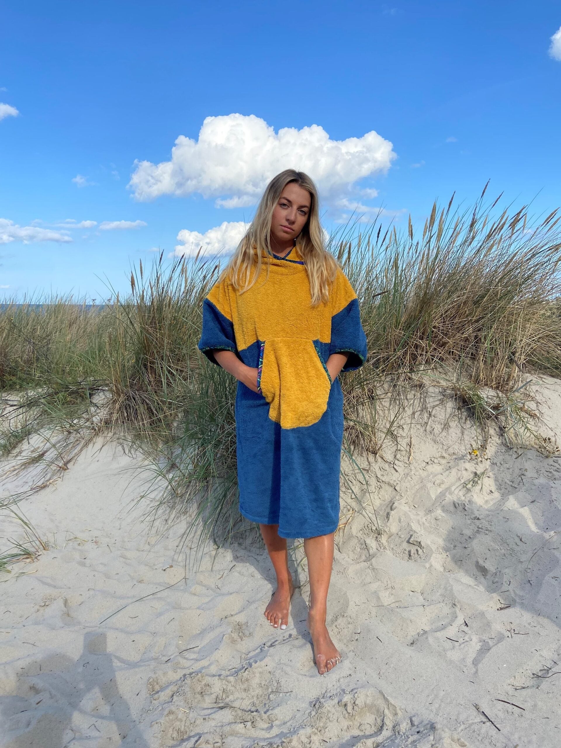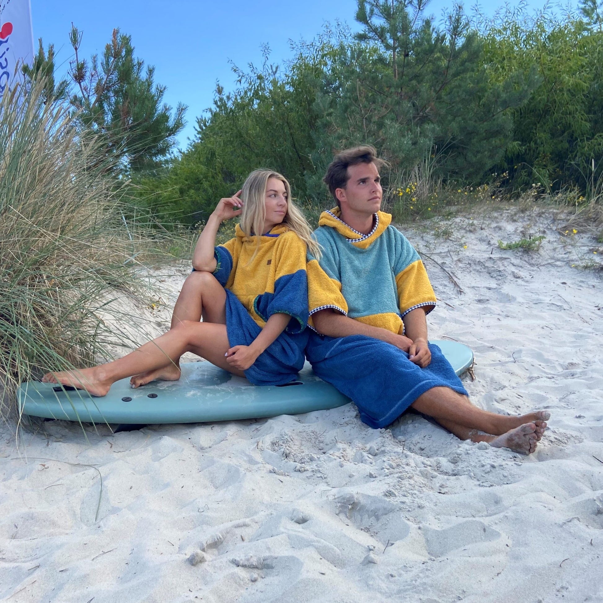 SUN & SEA to esencja lata: słońce, morze i… ponczo, które po wodzie otula jak ciepły ręcznik. Uszyte z naturalnej bawełnianej frotte (100%, 400 g/m²), szybko chłonie wilgoć i daje przyjemne ciepło. Luźny krój z kapturem działa jak szlafrok i prywatna przebieralnia w jednym – idealne na plażę, basen, camping, do kampera i do domu.